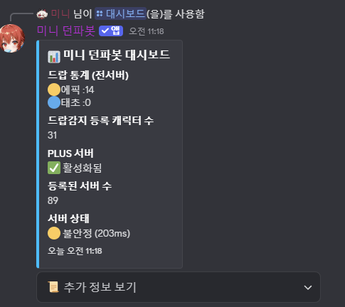 캐릭터 드랍 실시간 추적, 던담 딜·버프력 조회 , 모험단 통계, 시뮬레이션 뮤직기능까지 지원하는 소형 커뮤니티 맞춤형 던파 봇