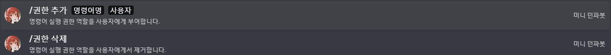 해당 명령어로 권한을 추가할시 서버에 새로 역할이 생기게되며 , 역할삭제 경우 서버에서 따로 삭제해야합니다.