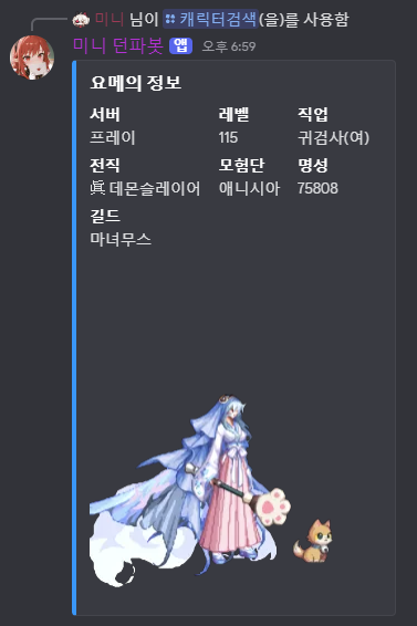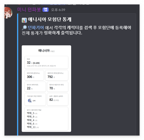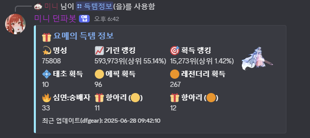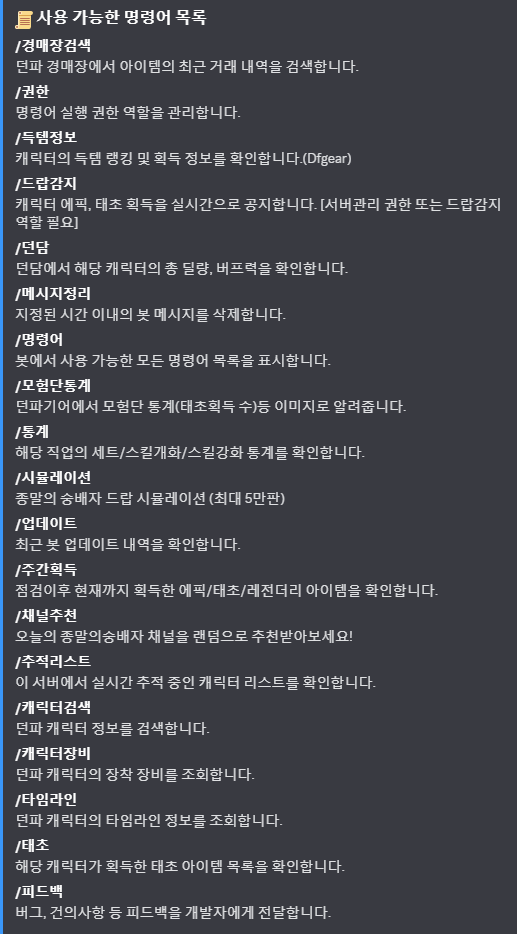 캐릭터 드랍 실시간 추적, 던담 딜·버프력 조회 , 모험단 통계, 시뮬레이션 뮤직기능까지 지원하는 소형 커뮤니티 맞춤형 던파 봇