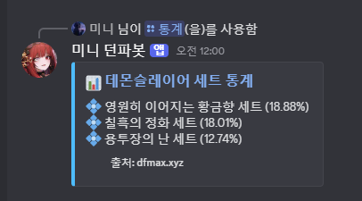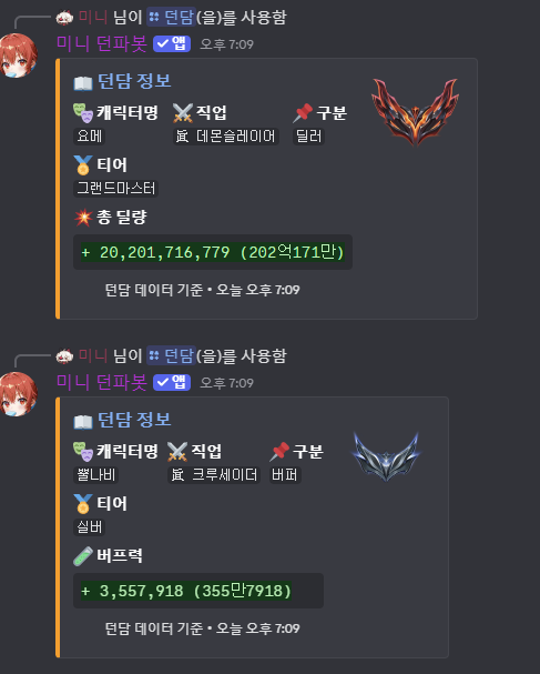 해당 명령어는 던담에서 정보를 직접 가져오기 때문에 지연시간이 4~10초 정도 소요됩니다.