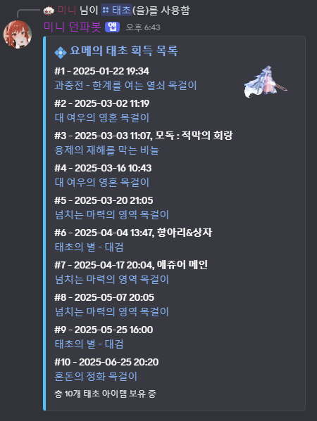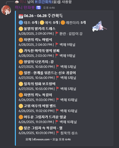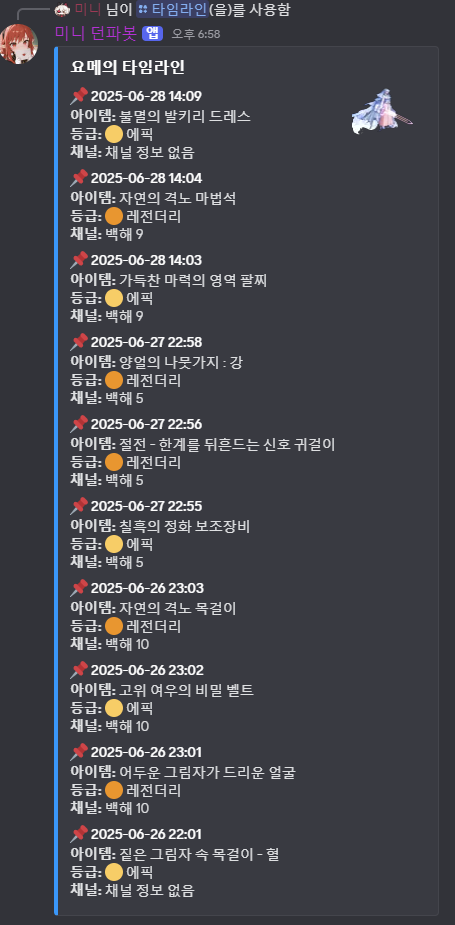 | 디스코드 미니 던파봇 (08-15) 드랍통계(에픽,태초) 업데이트 (5) | 2025.08.15 |