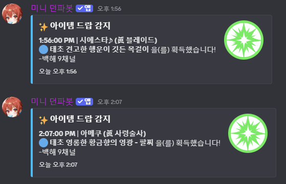 드랍감지를 등록하면 해당캐릭터가 에픽,태초를 획득 할 시 설정된 메시지 채널에 드랍 메시지가 전송되게됩니다.