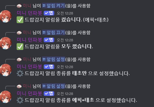 알림 설정으로 명령어로 특정 등급 (에픽, 태초 ,에픽+태초) 따로 설정할 수 있습니다.